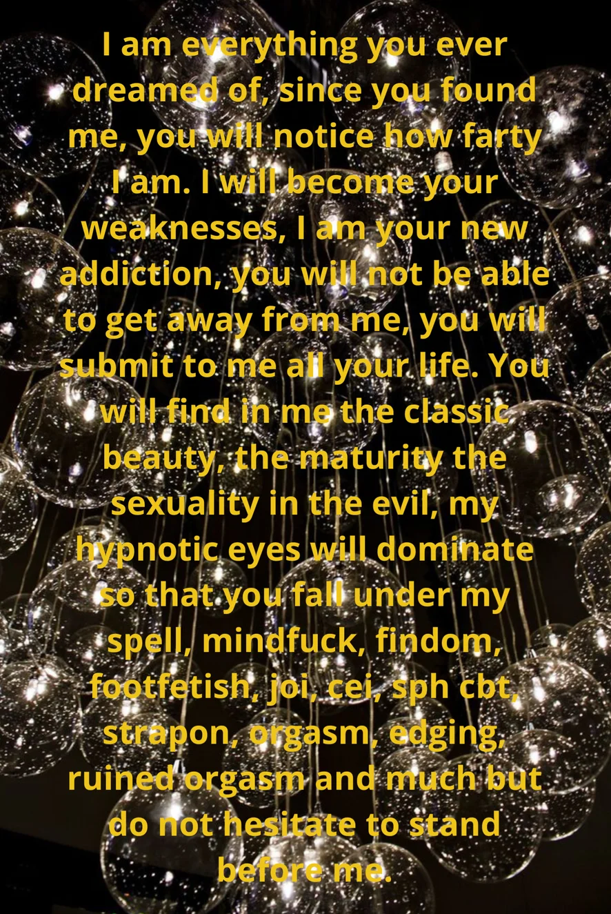 I am everything you ever dreamed of, since you found me, you will notice how farty I am. I will become your weaknesses, I am your new addiction, you will not be able to get away from me, you will submit to me all your life. You will find in me the classic beauty, the maturity the sexuality in the evil, my hypnotic eyes will dominate so that you fall under my spell, mindfuck, findom, footfetish, joi, cei, sph cbt, strapon, orgasm, edging, ruined orgasm and much but do not hesitate to stand before me.